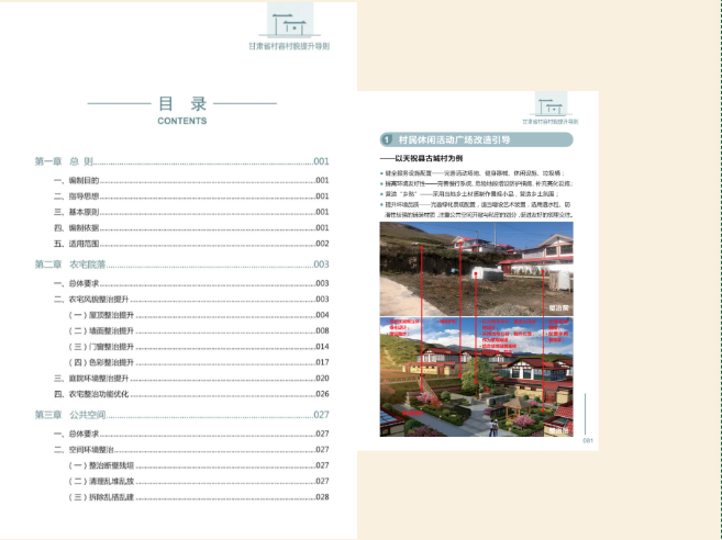 《導(dǎo)則》成果分為提升指引和示例圖集兩部分。提升指引部分,以文字形式明確了甘肅省村容村貌整治提升的要求和內(nèi)容,包括總則、農(nóng)宅院落、公共空間、道路街巷、綠化美化、環(huán)境衛(wèi)生、村落保護(hù)、保障機(jī)制和附錄等九個(gè)章節(jié),對全省5個(gè)國家級(jí)歷史文化名村和54個(gè)傳統(tǒng)村落實(shí)行特殊保護(hù);示例圖集部分,以圖文形式提出了村容村貌提升的多種、可選處理方法和典型案例,對應(yīng)提升指引中農(nóng)宅院落、公共空間、道路街巷、綠化美化、環(huán)境衛(wèi)生、村落保護(hù)等六部分內(nèi)容。