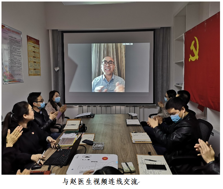本次主題黨日活動(dòng)還特別邀請到赴湖北武漢抗疫一線的趙振峰醫(yī)生(青海省心腦血管病??漆t(yī)院呼吸與危重癥學(xué)科主治醫(yī)師),通過視頻連線為全體參會(huì)人員上了一堂特殊又極富意義的黨課。據(jù)趙醫(yī)生介紹,他在2月7日接到青海紅十字會(huì)支援湖北的召集令后聞令而動(dòng),不到三個(gè)小時(shí)就奔赴武漢,成為華中科技大學(xué)附屬醫(yī)院救護(hù)轉(zhuǎn)運(yùn)隊(duì)中的一員,負(fù)責(zé)重癥和危重癥患者的轉(zhuǎn)運(yùn)工作。由于轉(zhuǎn)運(yùn)病患病情較重且行動(dòng)不便,轉(zhuǎn)運(yùn)工作極其辛苦且感染風(fēng)險(xiǎn)較大,他和他的同事不敢懈怠,小心細(xì)致的關(guān)注著工作的每個(gè)環(huán)節(jié);在問到趙醫(yī)生面對疫情感染的風(fēng)險(xiǎn),臨行出征前有沒有畏懼時(shí),趙醫(yī)生激動(dòng)的說道:“共產(chǎn)黨員應(yīng)是沖鋒陷陣的骨干力量,挺身而出既是一名醫(yī)務(wù)工作者的職責(zé)所在,也是一名黨員的使命職責(zé),我義不容辭”;趙醫(yī)生在講述完武漢抗疫工作的各種所見所感后,從專業(yè)角度出發(fā),為所有參會(huì)人員提供了9條防疫防護(hù)措施及建議,同時(shí)鼓勵(lì)大家一定要堅(jiān)定信念,繼續(xù)關(guān)注個(gè)人衛(wèi)生防護(hù)。在連線即將結(jié)束之際,全體人員起立為趙醫(yī)生鼓掌致敬,以此向他和他的同事們致以最崇高的敬意。